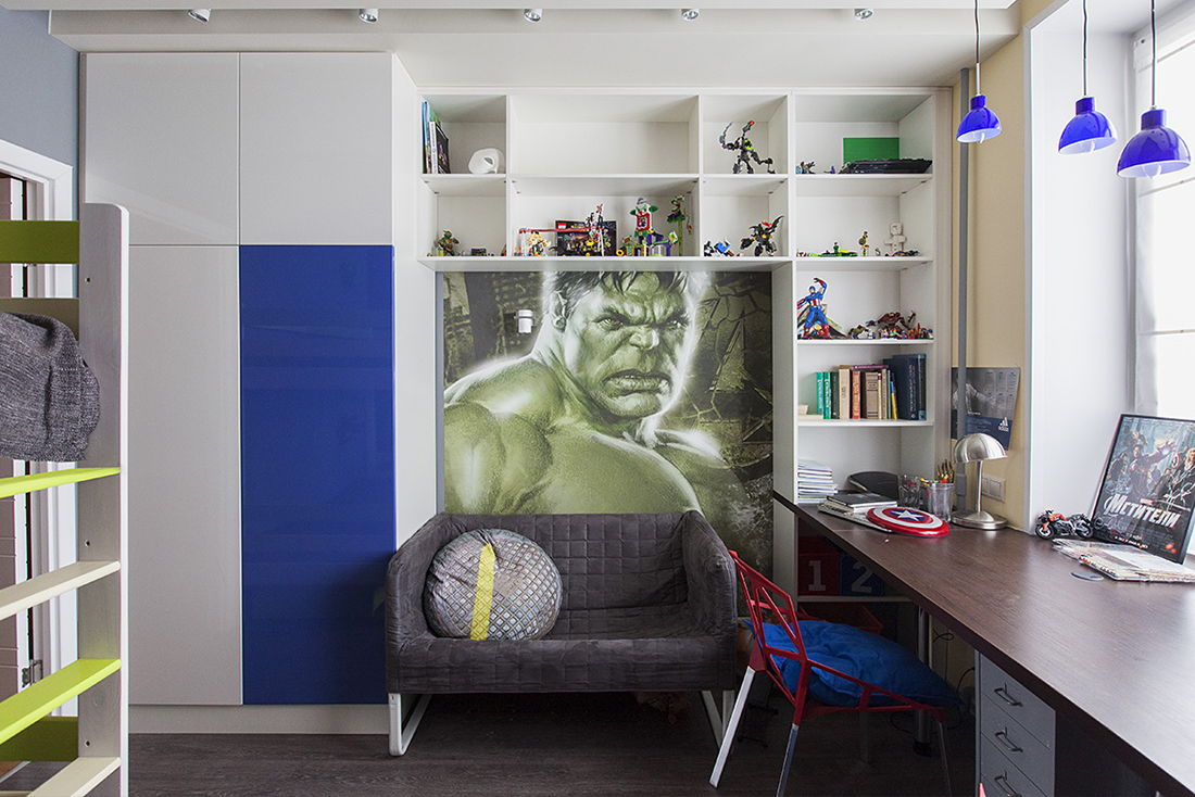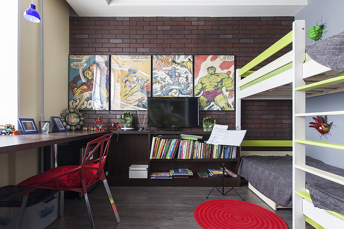 Современные дети очень часто увлекаются разными комиксами и героями мультфильмов. Они любят фэнтези и изображения разных супергероев. Такими оказались и два брата – хозяева новой детской. За основу проекта для их комнаты взяли комиксы и постеры с супергероями, которых так любят ребята.