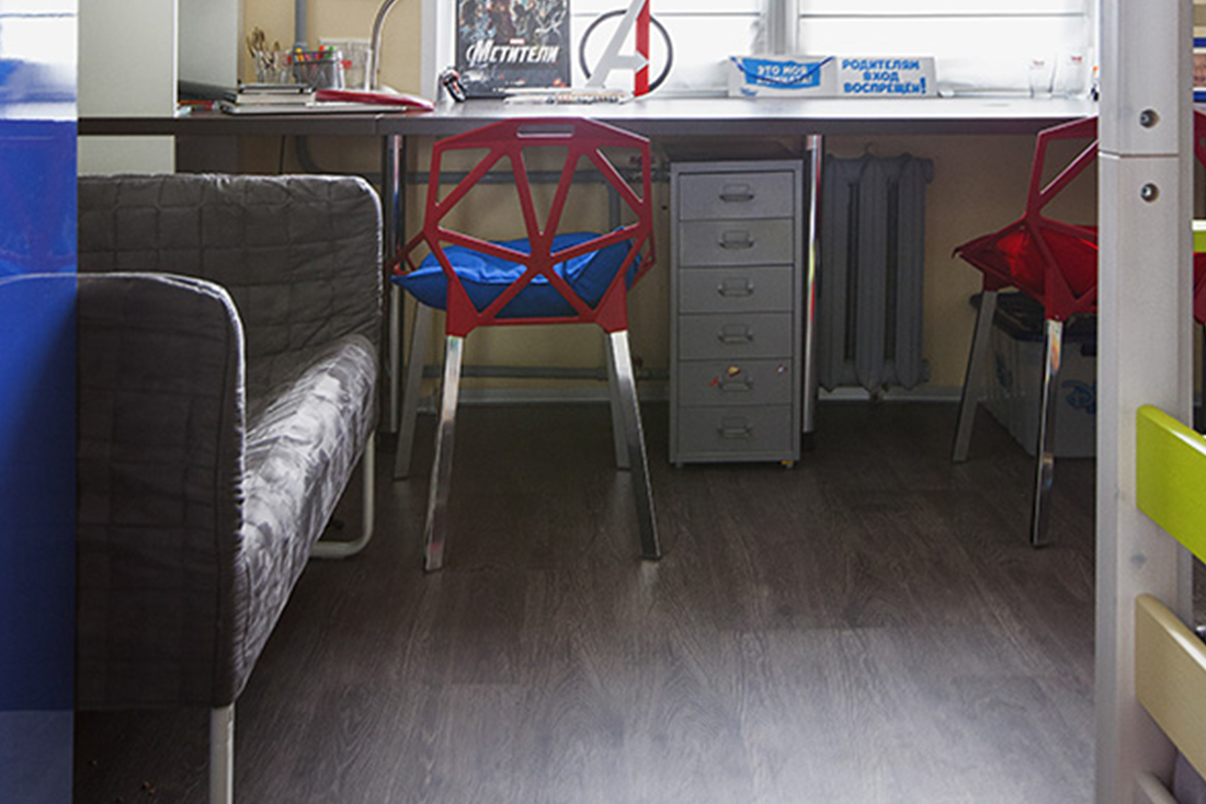 Логичнее всего было сделать интерьер в стиле лофт, потому на стене появился темный кирпич, а на пол уложили пробковый пол с печатью темного тонированного дуба. Пробковый в детской – это лучший выбор. Он тёплый и тихий, упругий и не притягивает пыль. Дети смогут играть, сидя на полу.