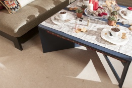 В этой гостиной дизайнер придумала все перевернуть с ног на голову – привычным напольным покрытием отделать потолок, а пол сделать похожим на светлый потолок. Любая доска и даже ламинат не подошли бы для реализации задуманного, потому в гостиной уложили очень светлый пробковый пол с еле заметной фактурой пробки.