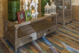 Прямая печать на пробке позволяет создавать любые рисунки и фактуры. Такой пол будто собран из разноцветных дощечек, потертых временем. На создание этой коллекции дизайнера вдохновили яркие рыбацкие лодки, которые часто можно встретить в Индонезии. Если собирать пол из таких реальных дощечек, получится очень трудоемко и дорого, а печать на пробке делает покрытие доступным любому покупателю. Это очень ценно.