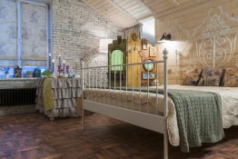 Наборный паркет – это всегда очень изысканно, но трудоёмко и дорого. Поэтому для этой спальни дизайнер выбрала пробковый пол с изображением наборного паркета. Это замковый пол, укладывать его так же просто, как паркетную доску или ламинат, а выглядит он как настоящий паркет.
