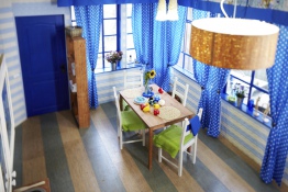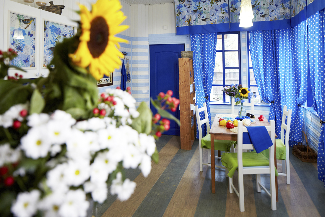 Обратите внимание на цветущую стену за лестницей – это тоже пробка, только настенная. Сначала её слегка затонировали с светлый оттенок. Этот слой стал основой для нанесения рисунка. Его напечатали на современном принтере так, чтобы при совмещении получился единый ковер. Затем пробку наклеили на ровную стену и покрыли защитным лаком. Таким образом стену дополнительно утеплили и создали звукоизоляцию. Тонировка пробки и на полу, и на стене умышленно в спокойных тонах, чтобы удачно оттенить яркую кухню и другие детали интерьера.