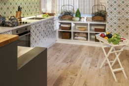 В этой столовой и кухне уложили светлый пробковый пол с печатью из коллекции Wood.